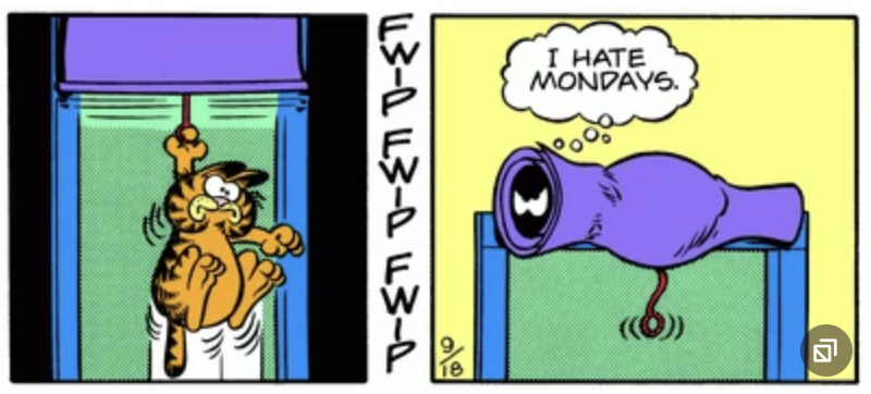 Anyway, back to “I Don’t Like Mondays.”  I was reminded that Garfield the cat also used to famously say, “I hate Mondays.”   I got to wondering if it was possible the song was inspired by Garfield. Or maybe Garfield ripped off the song?! Either way, what we have here is your basic Cat vs. Rat situation.