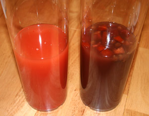The Red Prison Wine (pictured above) would be made with red grape juice, tomatoes, raisins, sugar, the dirty sock filled with moldy bread, and one packet of yeast. (I thought it would be interesting to add yeast to one batch and not the other, and compare the results.)