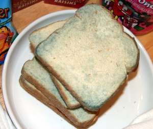 Getting slightly moldy bread proved to be more difficult than I expected. I bought the cheapest white bread I could find and waited for it to go green. I swear to God it stayed good for a month.