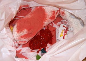 As for the White Prison Wine, it would contain: White grape juice and the moldy bread sock. No extra yeast added. For the requisite sugar, I went with some powdered drink mix, a few packets of ketchup and a handful of Tigger fruit snacks.