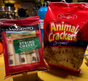 I asked if I could get her anything, (I’m great!), and she requested “animal crackers and string cheese.” Ah yes, what settles the stomach better than a tube of children’s mozzarella? And I guess when she’s not tossing her cookies, she likes eating them! (Ooh, that was strong — I’m on fire.)